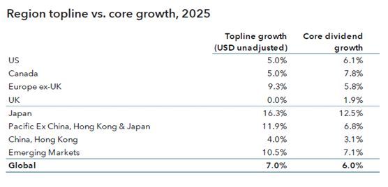 Japan led the way, with payouts rising twice as fast ( +12.5% ) as the global average, reflecting a greater focus on governance and shareholder remuneration, while the US, emerging markets, Canada and Europe all saw core growth of around 6% to 7% for the year.